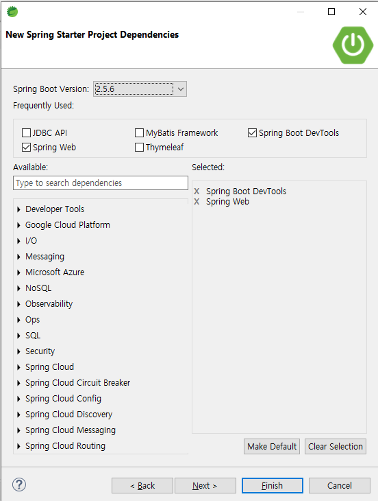 그리고 스프링 버전 및 부트생성시 의존받을 라이브러리 선택