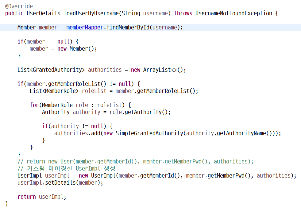 하지만 전과 다른점은 User객체를 기존 것을사용하지않고 여러정보를담은 UserImpl 클래스로 새로생성하여 커스텀마이징하였다.