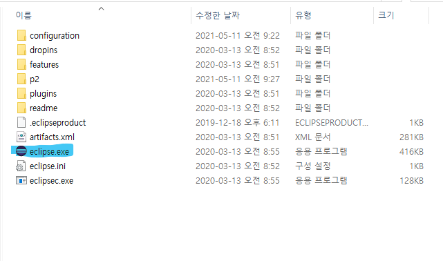 실행파일은 eclipse.exe 파일이용하여 실행하시면됩니다.